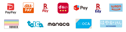クレジットカード(VISA・mastercard・JCB・アメリカンエキスプレス・ダイナーズクラブ・ディスカバー)QR決済・電子マネー(PayPay・auPAY・楽天Pay・d払い・メルペイ・楽天Edy・QUICPay・iD・nanaco・WAON・交通系IC)がご利用いただけます。